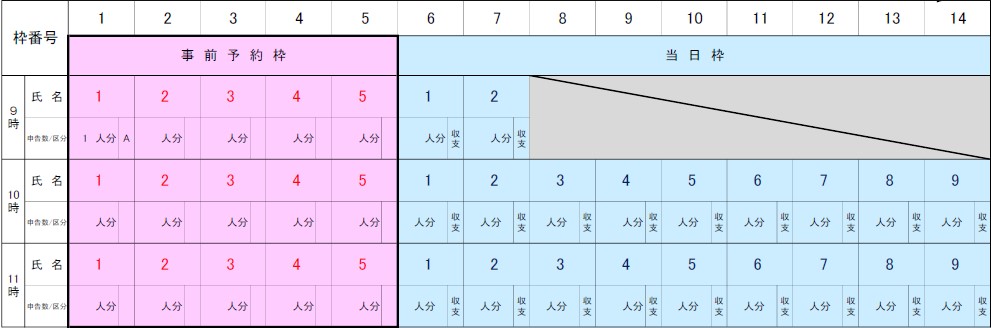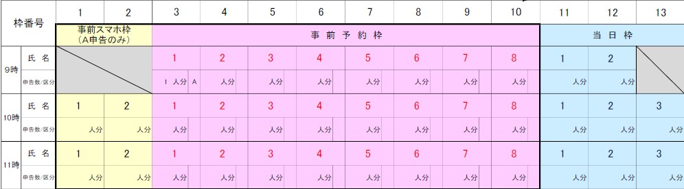 ※黄色:スマホ枠、ピンク:オンライン事前予約枠、水色:当日受付枠