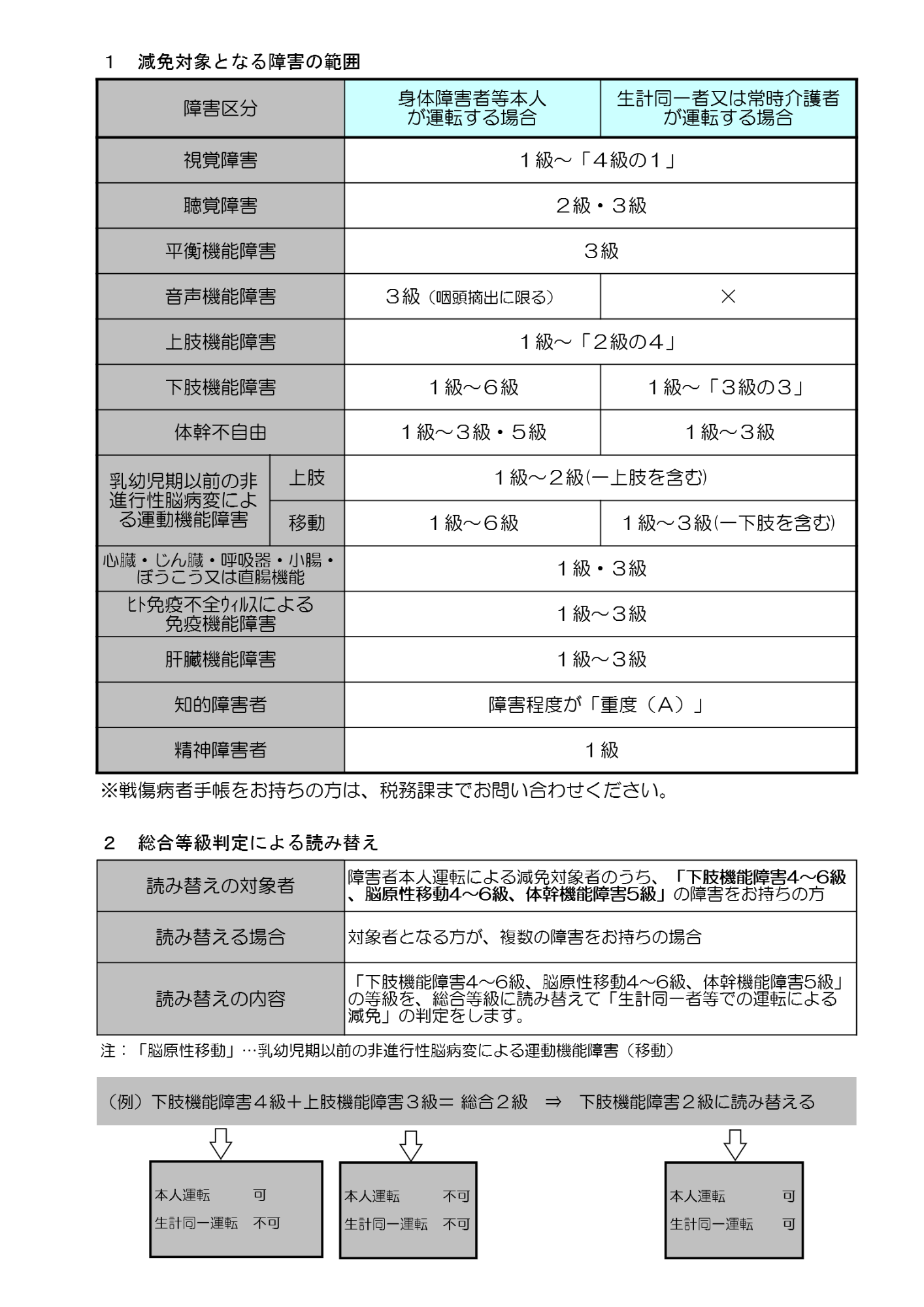 1手帳につき、1台までの減免になります。普通自動車の減免を受けられる方は、県税事務所で手続きしてください。障害の種類や等級、運転する人によって減免を受けられない場合がありますので、下の表1をよくご確認ください。
