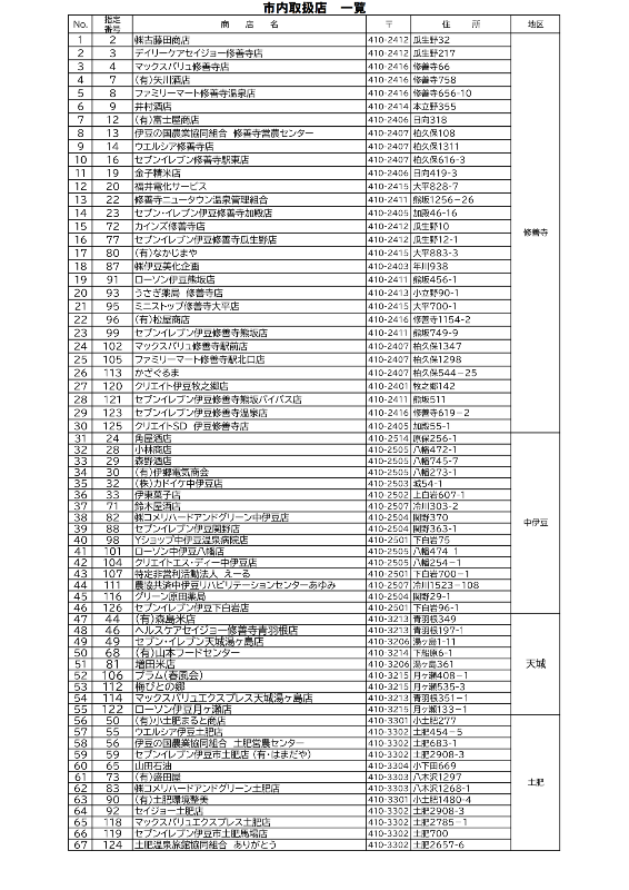 伊豆市の指定ごみ袋とごみ処理券は、下記の市内指定取扱店でご購入いただけます。