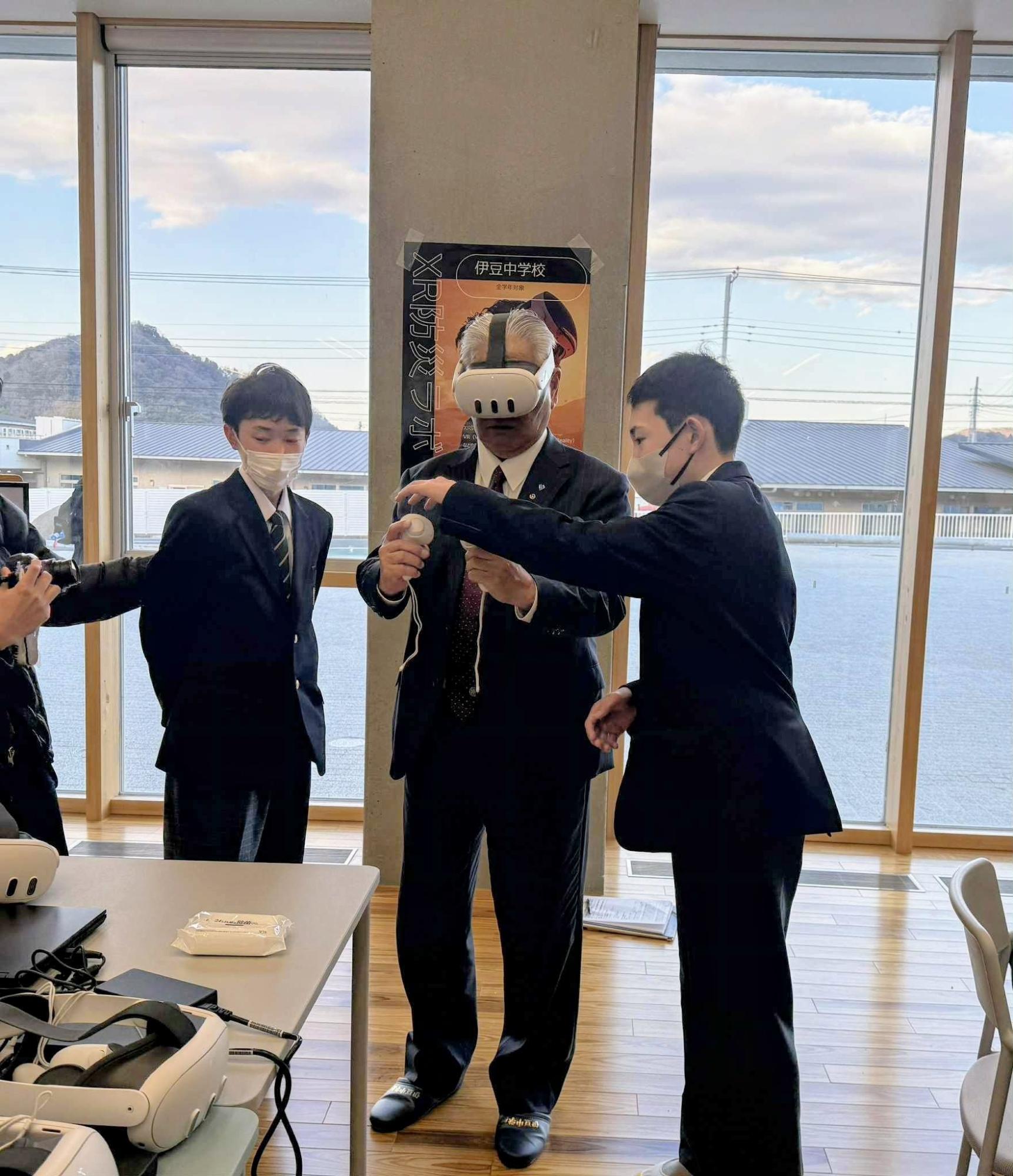 贈呈式では、感謝状の授与だけでなく、XR防災ラボの生徒たちが実際に最新機材を用いたデモンストレーションを実施しました。 生徒たちが大川会長に対し、VRゴーグルの操作方法を自らレクチャーする場面もあり、「自分たちの学んだ技術を大人に伝える」という貴重なアウトプットの機会となりました。大川会長からは、最新技術を自在に操る生徒たちの姿に、期待を込めたエールをいただきました。