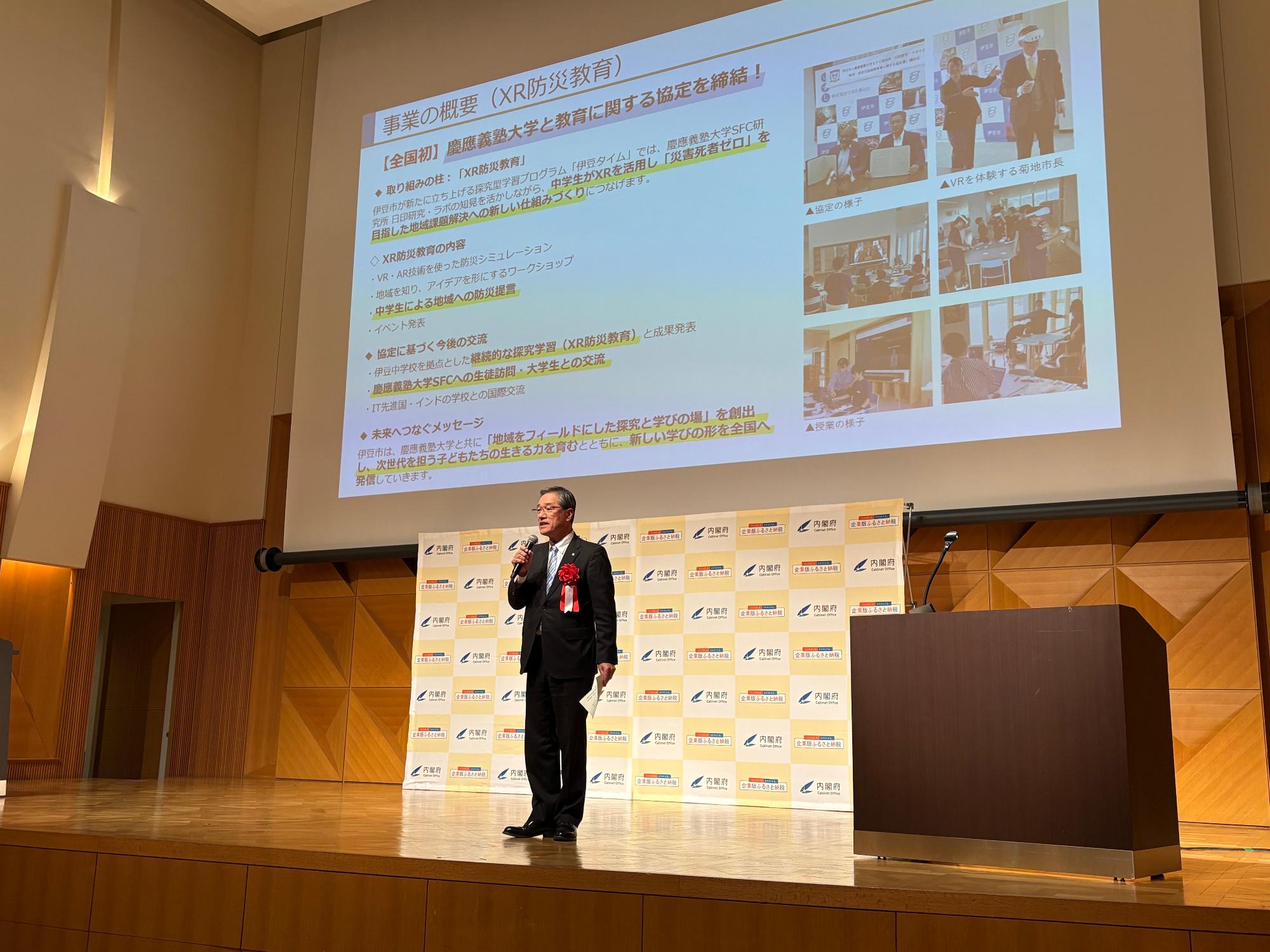 伊豆中学校XR防災ラボのメンバーも登壇し、菊地市長のプレゼンのお手伝い