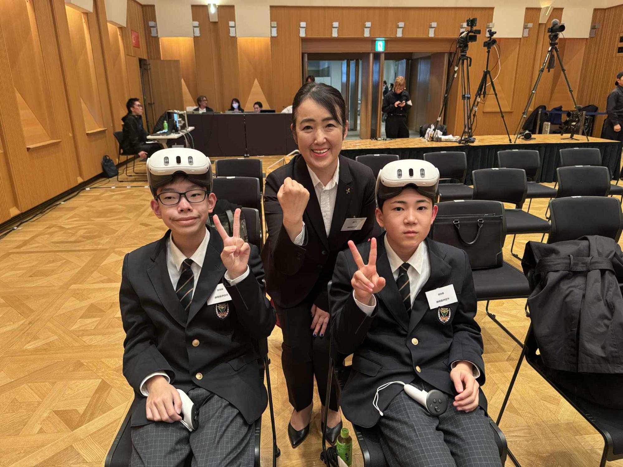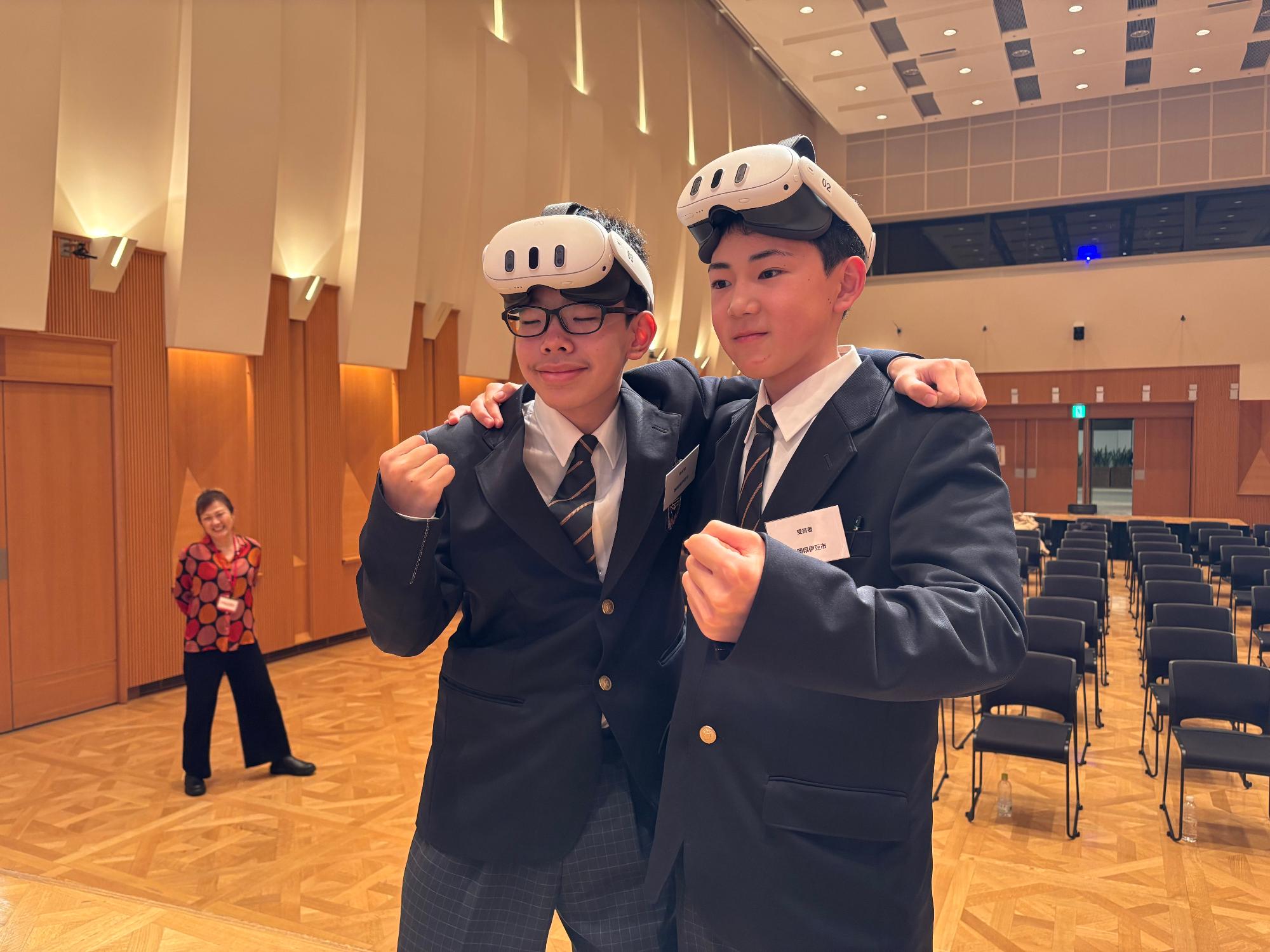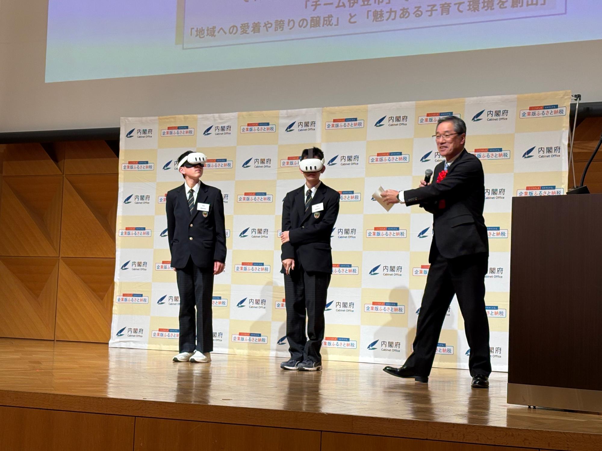 授賞式のメインプログラムの1つである市長プレゼンテーションでは、ラボの生徒2名が登壇。今月13日に株式会社グランバー様より寄附いただいた最新鋭のVRゴーグルを装着し、堂々としたデモンストレーションを披露しました。