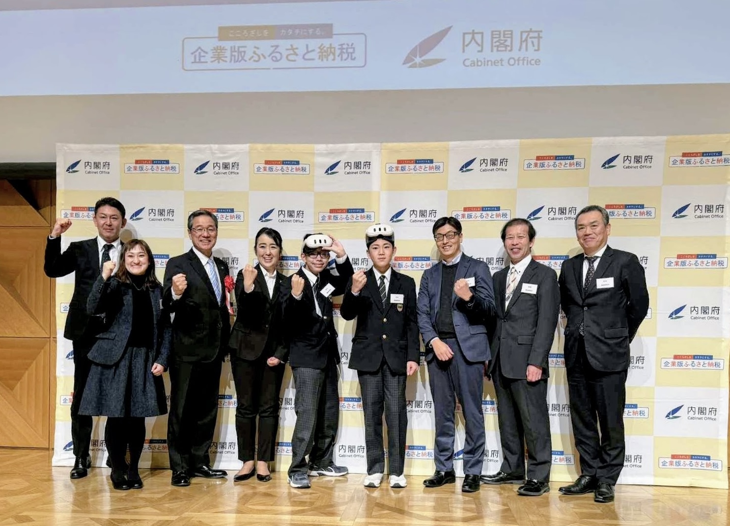 記者のリクエストによりガッツポーズを取るXR防災ラボのメンバー