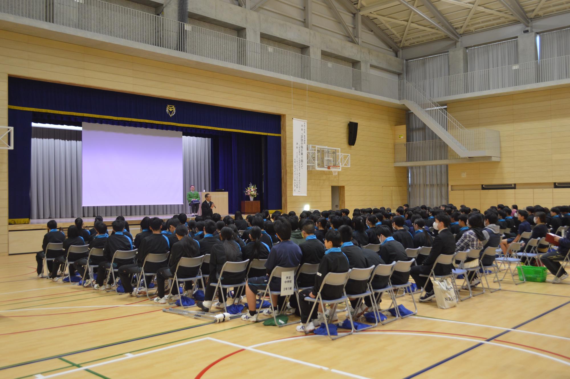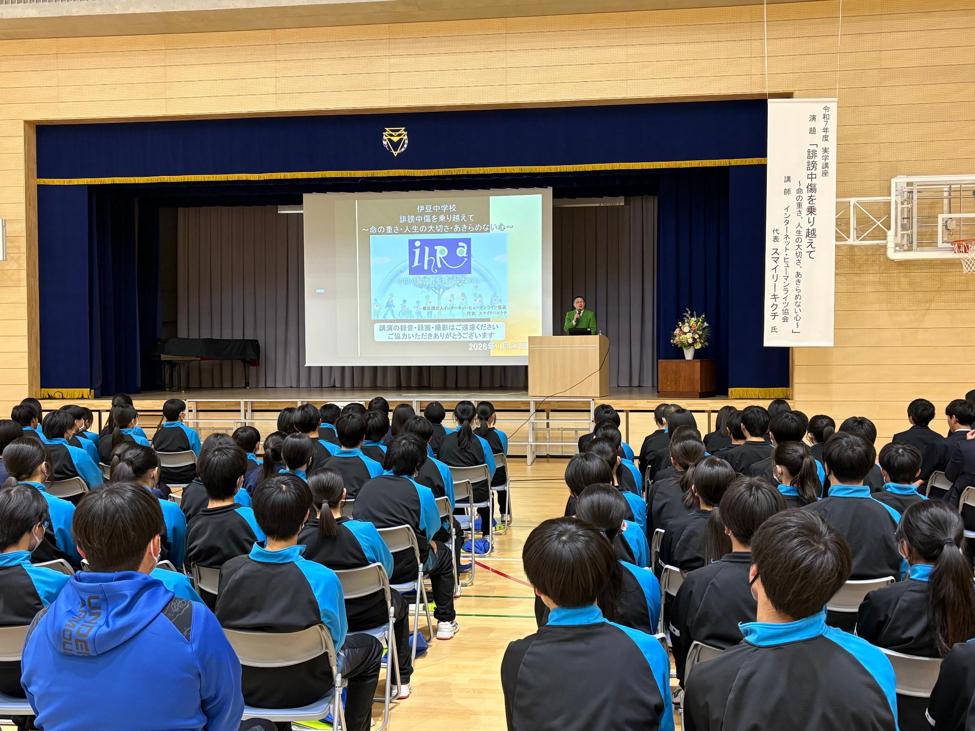 対象は、14歳という多感な時期にある伊豆中学校2年生(158名)と土肥小中一貫校8年生(10名)、そして保護者の皆様です。総勢168名が同じ場所に集い、同じ「生きた言葉」を聴くことで、共通の危機意識を持つ貴重な時間となりました。