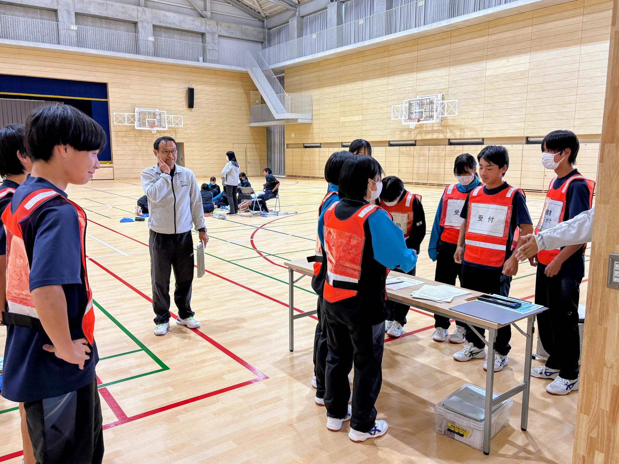 避難所における受付訓練をする生徒たち