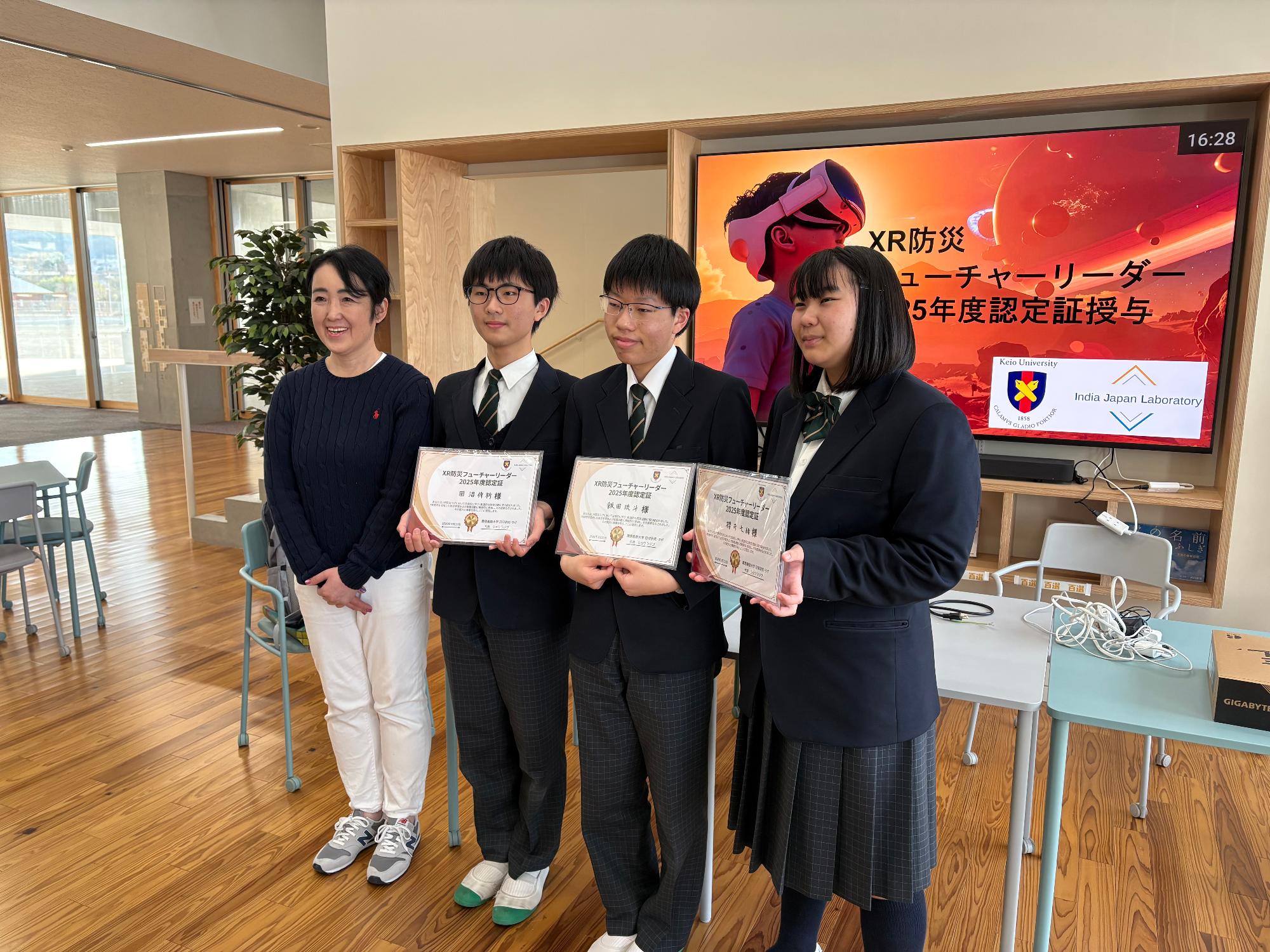 これまで直接ご指導いただいた慶應義塾大学SFC研究所 日印研究・ラボの高根佐知子先生より、3年生一人ひとりに「XR防災フューチャーリーダー 2025年度認定証」が手渡されました。また、1・2年生についても、今年度の活動の歩みを共にしてきた生徒に対し、同様に認定証が授与されました。
