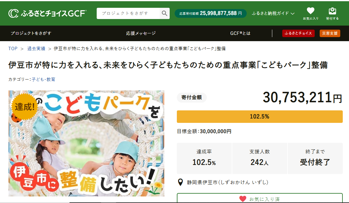 令和7年9月1日から令和8年1月31日までの間、寄付を募っていた「こどもパーク整備プロジェクト」につきまして、30,753,211円のご寄付をいただき、目標金額(30,000,000円)を達成することができました。