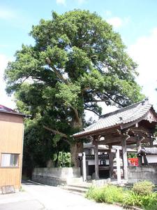 茅葺の山門前の石段に覆いかぶさるように大きく枝を広げています。目通幹囲4.68メートル、根元周囲5.22メートル、樹高14.9メートル、樹齢はおよそ600年と推定されてます。枝張りは、東西17.0メートル、南北10.6メートルで、平成2年春、調査にあたった環境庁自然公園指導員による巨木ランキングでは、全国第2位に相当するということです。