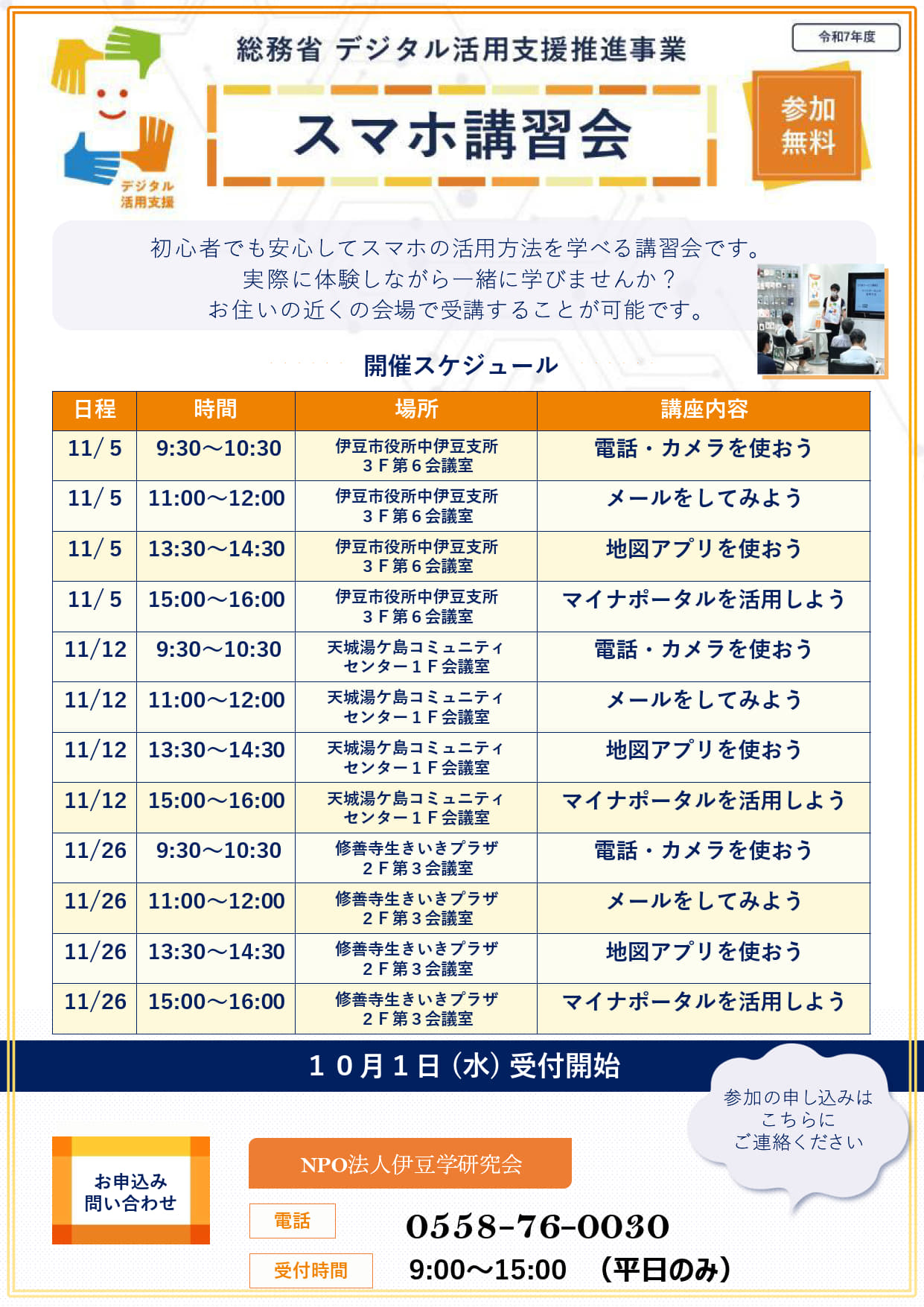 伊豆市は、AI・ICTなどのデジタル技術を最大限活用し、誰にでも心地よく、活気あふれる自立したまちづくりを目指し、市民の皆様がデジタル社会の利便性を実感できるよう、デジタル機器の操作に不慣れな方を対象としたスマホ講習会を開催します。